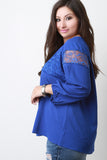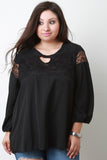 This plus size top features textured fabric, contrast semi-sheer floral lace panel, round neckline, keyhole cutout, and long bishop sleeves. Accessories sold separately. 100% Polyester.