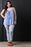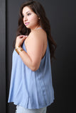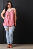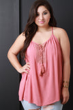 This plus size top features a sleeveless design, scoop neckline, rope tie with tassel detail, crochet dot lace inset, gather detail, and a wide cut hem for a breezy fit. Accessories sold separately. Made in U.S.A. 100% Rayon.
