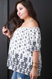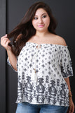 This plus size top features an elastic off the shoulder neckline, self tie keyhole, decorative tassels on the tie, printed lightweight gauze fabrication, short sleeves and a breezy wide cute hem for a loose and relaxed fit. Accessories sold separately. Made in U.S.A. 100% Rayon.