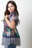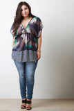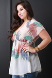 This plus size top features a chiffon fabrication, deep v neckline, tropical leaf print, elastic waist, open flutter sleeve, tie across back, flare cut hem. Accessories sold separately. Made in U.S.A. 100% Polyester