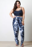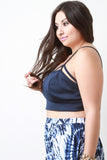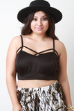 This plus size crop top features smooth stretch fabric, caged strappy design, and spaghetti straps. Accessories sold separately. Made in USA. 92% Polyester, 8% Spandex.