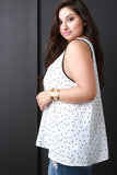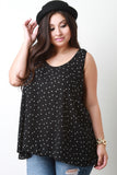 This top features contrasting stars prints, round neckline, v-back with a secure strap at nape, A-line cut, and sleeveless construction. Accessories sold separately. Made in U.S.A. 100% Polyester.