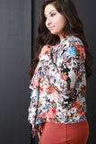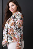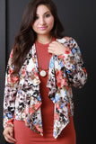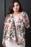This plus size blazer has long sleeves and a cascading open front. Textured semi sheer fabrication. Mixed floral print throughout. Accessories sold separately. 100% Polyester.