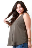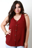 This chic plus size top featured a textured woven fabric, faux button-up design, one front posket, scoop neckline, and sleeveless fit. Finished with a rounded hemline and relaxed fit. Accessories sold separately. Made in U.S.A. 100% Polyester.