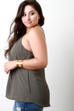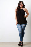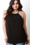 This casual plus size to p features a textured woven fabric, halter neckline with pleating detail. and sleeveless construction. Finished with a button hook closure at nape and slightly high-low hemline. Accessories sold separately. Made in U.S.A. 100% Polyester.