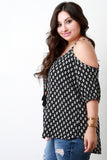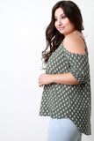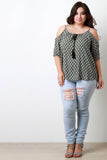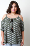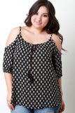 This beautiful plus size top featues a woven fabric designed with a boho print pattern, boat neckline with selt-tie twisted lace tassel, cold shoulder, and elasticized elbow sleeves. Accessories sold separately. Made in U.S.A. 100% Rayon.