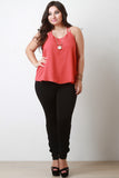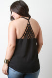 This plus size top features scoop neckline, double spaghetti straps, strappy caged triangle back. Accessories sold separately. 100% Rayon.