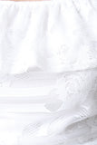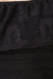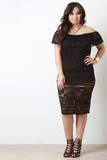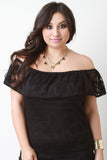 This plus size top features a stretch lace fabrication, off the shoulder neckline, ruffle sleeve, knit lining, and a relaxed fit. Accessories sold separately. Made in U.S.A. Self: 98% Polyester 2% Spandex. Lining, 100% Polyester.