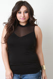 This plus size top features a mesh yoke design with a cowl neckline and sleeveless bodice. Finished with ruched sides. Accessories sold separately. 97% Rayon. 3% Spandex. Con: 90% Nylon, 10% Spandex.