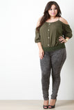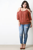 This plus size top features a scooped neckline with a cold shoulder design and elasticized ends short sleeves. Textured woven knit. Decor buttons along the front. Finished with an elasticized crochet lace hemline. Accessories sold separately. 100% Rayon.