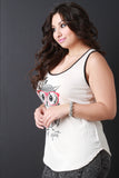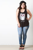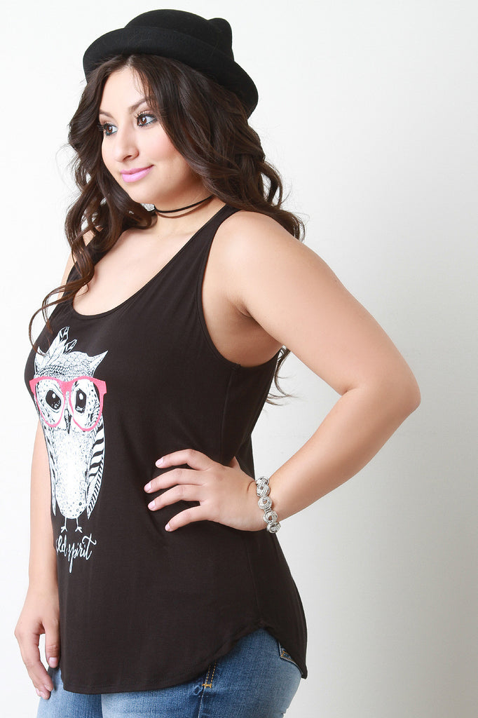 This plus size top is sleeveless design, featuring a scooped neckline and racerback. Animation owl print at front with text, "Wild Spirt". Soft knit. Curved hemline. Accessories sold separately. 97% Rayon. 3% Spandex.