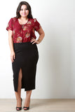 This plus size top features a lightweight chiffon fabrication vintage inspired floral print, rounded neckline, gathered detail at neckline and sleeve, back keyhole and a wide cut hemline. Accessories sold separately. 100% Polyester.