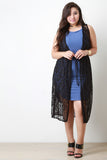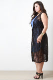 This plus size longline vest features a semi-sheer floral lace, open front construction with cinched waistline, and front tie closure. Accessories sold separately. 92% Nylon, 8% Spandex.
