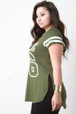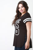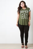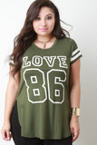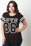 This plus size sporty tee features a soft knit fabrication, screen printed "Love 86" graphic print with double stripes on each sleeve, a rounded neckline, finished with a rounded side slit high low hemline. Accessories sold separately. 97% Rayon, 3% Spandex.