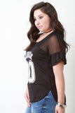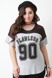 This plus size tee features a soft knit fabrication with contrast mesh yoke, "Flawless 90" graphic print, short sleeves, rounded neckline, with a rounded hemline and a fitted silhouette. Accessories sold separately, 97% Rayon, 3% Spandex. Contrast: 90% Nylon, 10% Spandex.