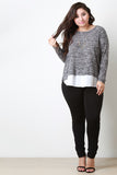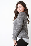 This plus size sweater features a marled knit fabrication, rounded neckline, long sleeves, relaxed fit, and a contrast hem for faux button up layered appearance. Accessories sold separately. Made in U.S.A. 53% Polyester, 43% Rayon, 4% Spandex Contrast 100% Polyester.