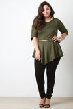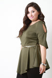 This cutesy plus size top features a cold shoulder design, elbow sleeves, boat neckline, peplum detail, and includes a chain belt. Accessories sold separately. Made in U.S.A. 95% Polyester, 5% Spandex.