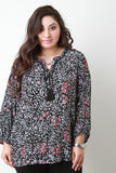 This peasant-style plus size top features a lightweight fabric with floral prints throughout, tassel lace up detail at neckline, long cinched sleeves, and loose fit. Accessories sold separately. 100% Rayon.