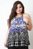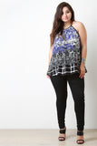 This plus size top features a graphic printed chiffon fabric, halter neckline with pleating details, and sleeveless construction. Finished with a button hook closure at nape. Accessories sold separately. Made in U.S.A. 100% Polyester.