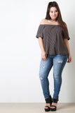 This cozy plus size top features a contrasting ribbed knit fabric, elasticized off the shoulder neckline, and short sleeves construction. Accessories sold separately. Made in U.S.A. 60% Rayon, 30% Polyester, 10% Spandex.