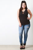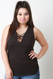 This plus size top features a v-neckline with crisscross caged design, sleeveless, stretchy sculpture fit, and side ruched hem. Accessories sold separately. Made in U.S.A. 90% Polyester, 10% Spandex.