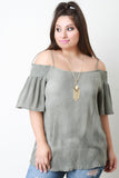 This plus size top features an off-the-shoulder collar line, spagetti straps, and short sleeves. Crinkled woven gauze, lightweight, unlined. Flare cut. Slight high-low hem. Comes with necklace, other accessories sold separately. 100% Rayon.