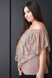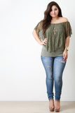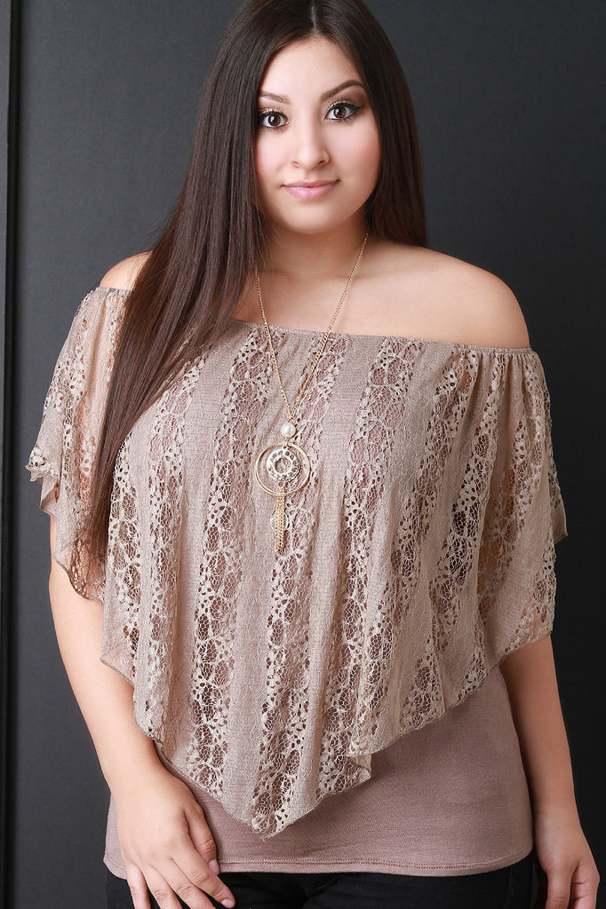 This trendy plus size top features an asymmetrical hem patterned lace overlay with jersey underlay, off the shoulder neckline, and includes a charm necklace. Made in U.S.A. Self: 92% Nylon, 8% Spandex. Contrast: 97% Rayon, 3% Spandex.