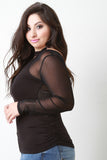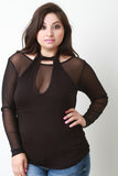 This plus size top features a keyhole halter neckline, high waisted cinched seam, elasticized ruched sides, and a semi-sheer long sleeves mesh underlay top. Made in U.S.A. 97% Rayon, 3% Spandex. Contrast: 90% Nylon, 10% Spandex.