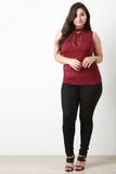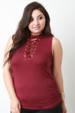 This plus size top features a mock neckline, large eyelet, corset lace-up yoke, sleeveless, and elasticized ruched sides. Accessory sold separately. Made in U.S.A. 97% Rayon, 3% Spandex.