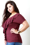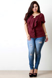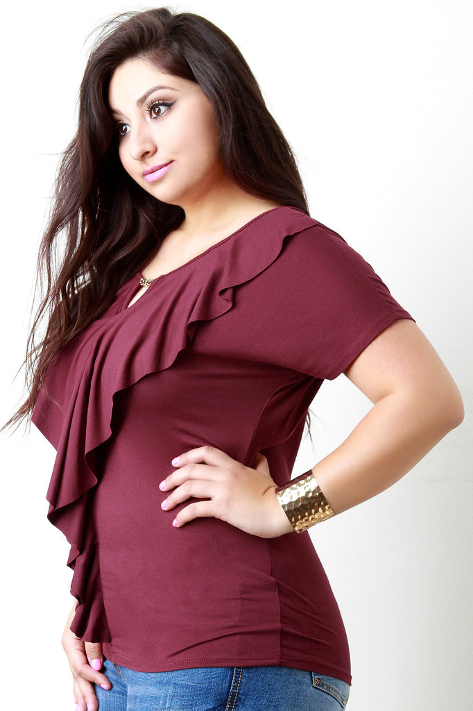 This plus size top features a soft stretchy knit, scoop neckline, front ruffle and gold accent detail with keyhole, and short sleeves. Accessories sold separately. Made in U.S.A. 94% Polyester, 6% Spandex.
