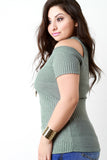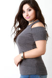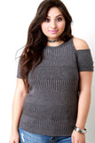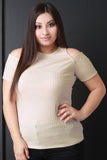 This plus size top features a cozy ribbed knit, round neckline, short sleeves with cold shoulder cutouts, and stretchy sculpture fit. Made in USA. 70% Polyester, 26% Rayon, 4% Spandex.