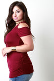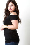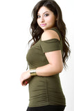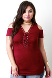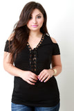 This plus size top features a jersey knit fabric, eyelet trimmed lace up v-neckline, cold shoulder and short sleeves. Finished with a rounded hemline and ruched sides. Accessories sold separately. Made in U.S.A. 97% Rayon, 3% Spandex.