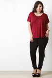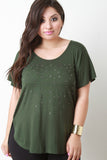 This plus size tee features a jersey knit fabric, grommets and crystals design at front, scoop neckline, and short dolman sleeves. Finished with a rounded hemline. Accessories sold separately. Made in U.S.A. 97% Rayon, 3% Spandex.