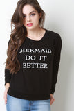 A fleece-like brushed hacci long cuffed sleeves , and a print that reads, "Mermaid Do It Better." Accessories sold separately. Made in U.S.A. 68% Polyester, 4% Spandex, 28% Rayon.