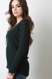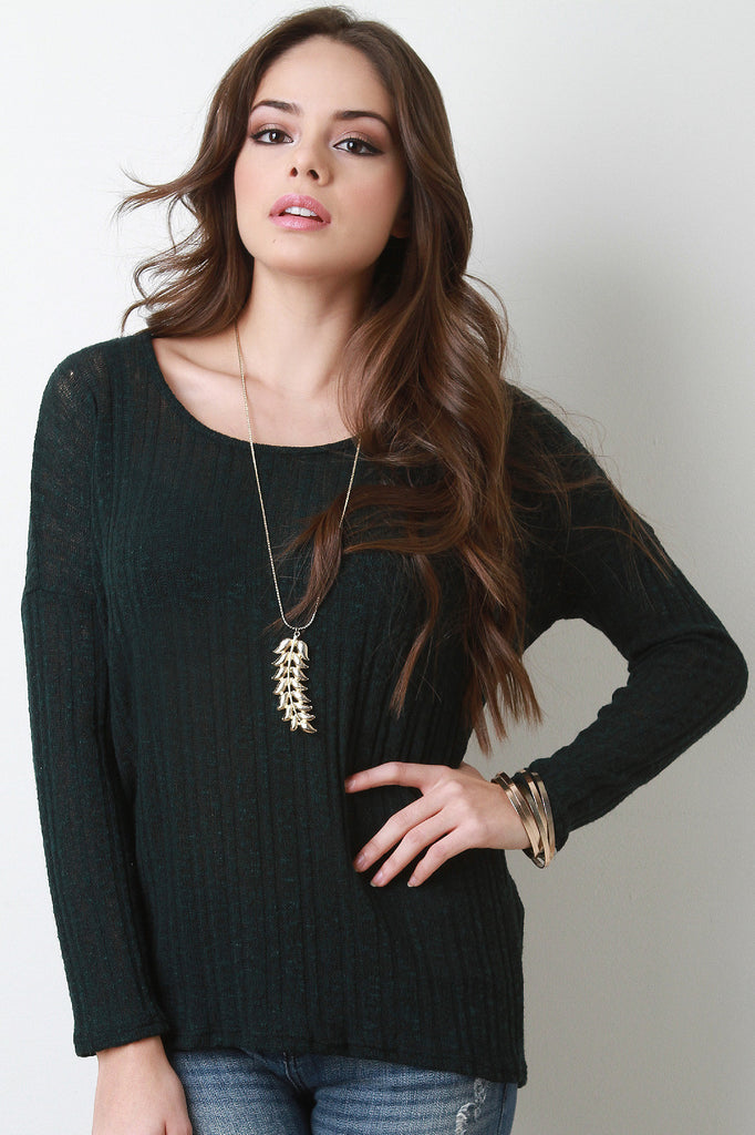 This top features a ribbed loose knit, scooped round neckline, and dropped shoulders with long sleeves. Accessories sold separately. Made in USA. 51% Rayon, 47% Polyester, 2% Spandex.