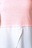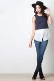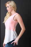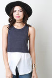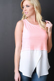 This casual top features a jersey knit fabrication, sleeveless construction, and a round neckline. Finished with a two tone color design, an asymmetrical and high low hemline. Accessories sold separately. Made in U.S.A. Self: 50% Polyester, 30% Cotton, 13% Rayon. Contrast: 100% Polyester.