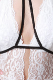 A sleeveless floral lace bodysuit featuring thin halter straps that tie at the neck, and a plunging v-neckline. Accessories sold separately. 96% Polyester, 4% Spandex.