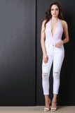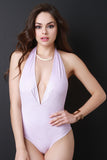 This vegan suede bodysuit features a deep v-neckline, self-tie halter neckline, open back, high waisted cinched seam, brief bottom, and a double snap button closure at crotch. Accessories sold separately. Made in U.S.A. 90% Polyester, 10% Spandex.