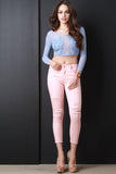This semi-sheer mesh top features a round neckline, long sleeves, crop hemline, and embroidery floral lace patch at breast. Accessories sold separately. Made in U.S.A. 95% Polyester, 5% Spandex.
