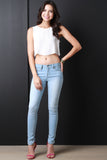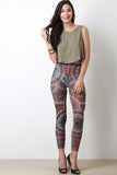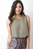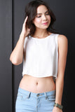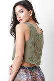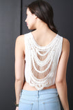 This sleeveless top features a round neckline, crop hemline, and a semi-sheer crochet lace back. Accessories sold separately. 100% Rayon.