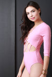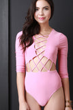 This bodysuit features three quarter sleeves, plunging neckline, strappy front cut out, knit fabrication, and invisible zipper back closure. Accessories sold separately. Made in U.S.A. 96% Polyester, 4% Spandex.