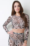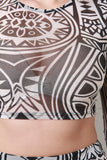 This mesh crop top feature a semi-sheer tribal print throughout, round neckline, long sleeves, and crop hem. Accessories sold separately. Made in U.S.A. 100% Polyester.