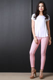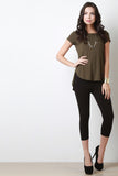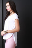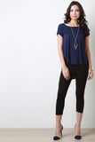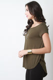 This open back top features a soft knit fabrication, cap sleeves, a scoop neckline, rounded high low hem, open slit sides, open back with strap across opening. Accessories sold separately. Made in U.S.A. 96% Rayon, 4% Spandex.