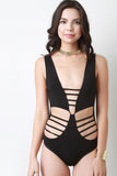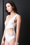 This flirty bodysuit features stretch fabric, plunge neck, cut out panels, strappy caged design, deep scooped back, and double snap button closure at crotch for easy on/off. Accessories sold separately. 95% Polyester, 5% Spandex.