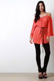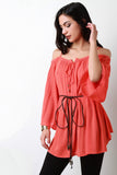 This cute top features a cold shoulder design, spaghetti straps, off the shoulder long flare sleeves, lace up front, embroidered cutout trim, lightweight woven fabrication, and a vegan leather braided belt. Accessories sold separately. 100% Rayon.