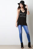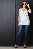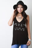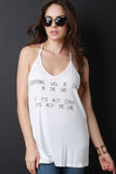 This sleeveless top features a graphic print that says " Everything will be ok in the end. If it's not ok it's not the end." spaghetti straps, v shaped neckline, T back, relaxed loose fit finished with side slits. Accessories sold separately. Made in U.S.A. 95% Rayon, 5% Spandex.