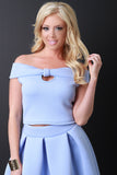 This cute crop top features a bardot neckline, neoprene knit fabrication, off the shoulder sleeves, bow detail, front keyhole, finished with a cropped hem. Accessories sold separately. Made in U.S.A. 92% Polyester, 8% Spandex.