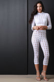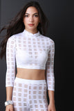 This top features a semi-sheer fishnet fabrication with grid outline, mock neckline, three quarter sleeves, and cropped hemline. Accessories sold separately. Made in U.S.A. 90% Nylon, 10% Spandex.