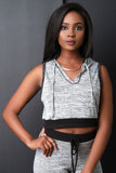 This top features a marled knit fabrication, sleeveless fit, attached back hoodie, and cropped hemline with contrasting ribbed knit detail. Accessories sold separately. Made in U.S.A. Self: 80% Rayon, 17% Polyester, 3% Spandex, Contrast: 86% Polyester, 10% Rayon, 4% Spandex.