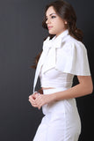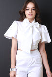 This crop top features a front button up closure, self tie bow collar, gathered detail flare sleeves and a fitted bodice. Accessories sold separately. Made in U.S.A. 92% Cotton 8% Spandex.